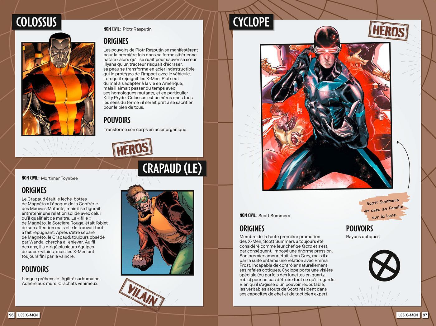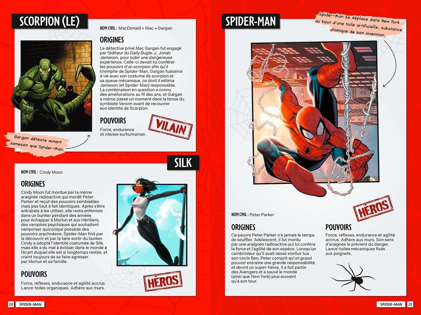 Origines, pouvoirs, anecdotes, le tout accompagné d’illustrations tirées des comics, les héros et vilains n’auront plus de secret pour vous !