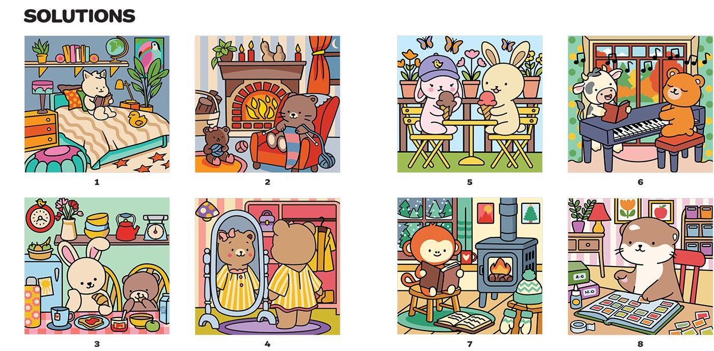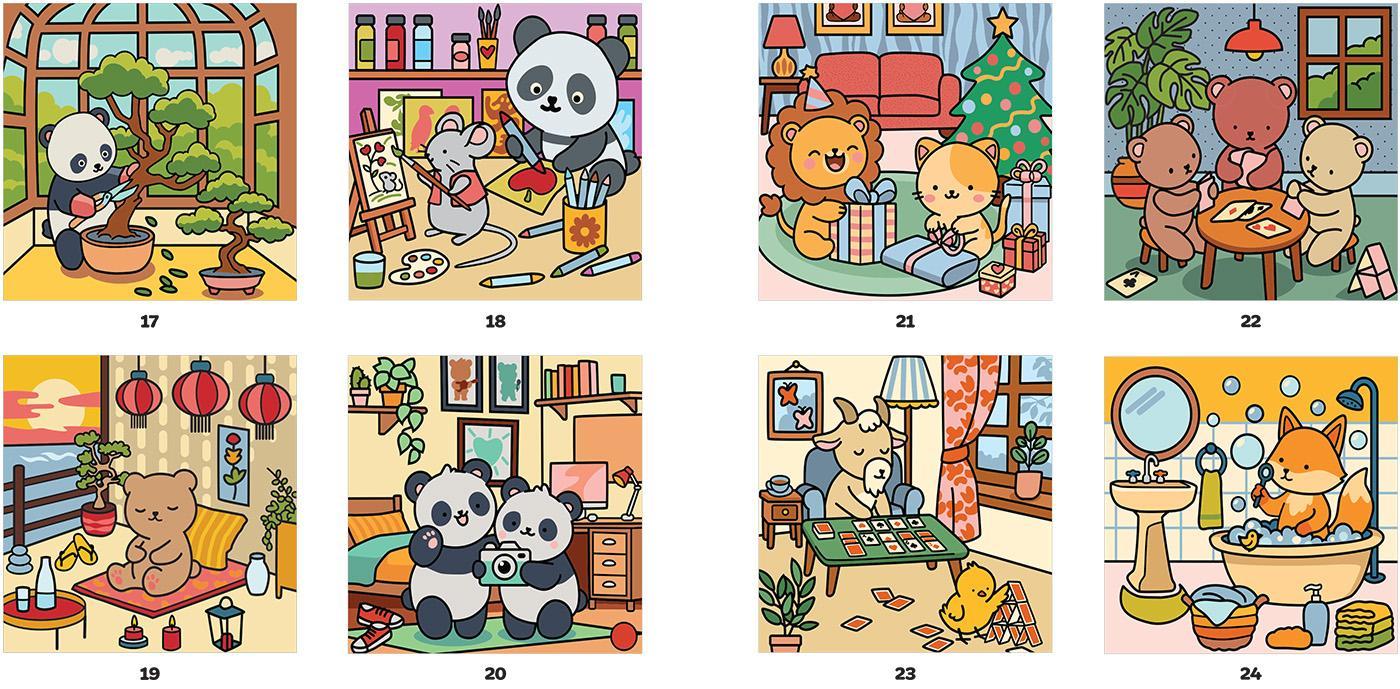 Qu’ils soient en train de danser dans le salon, de jardiner, de peindre, de jouer aux cartes ou du piano, ces adorables petits animaux n’attendent que vous pour retrouver leurs couleurs.