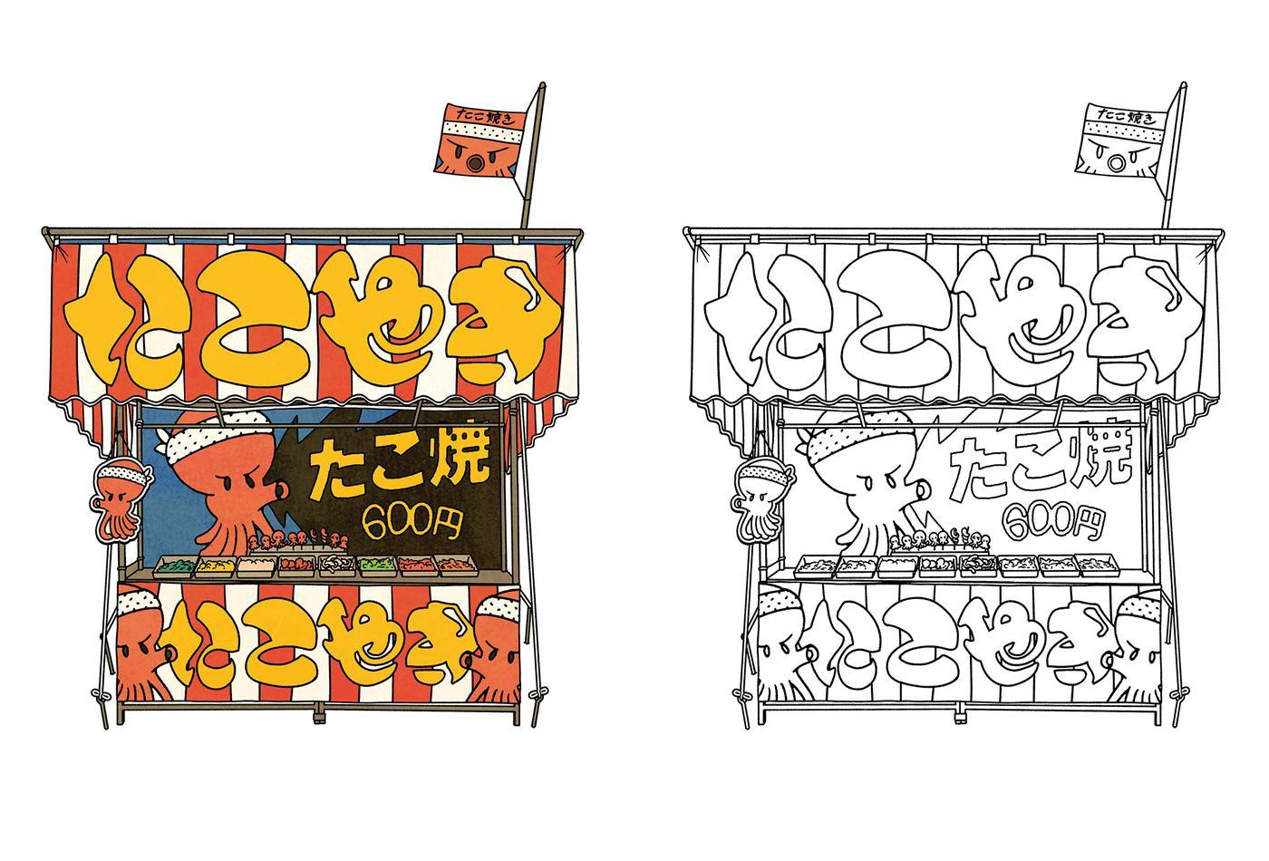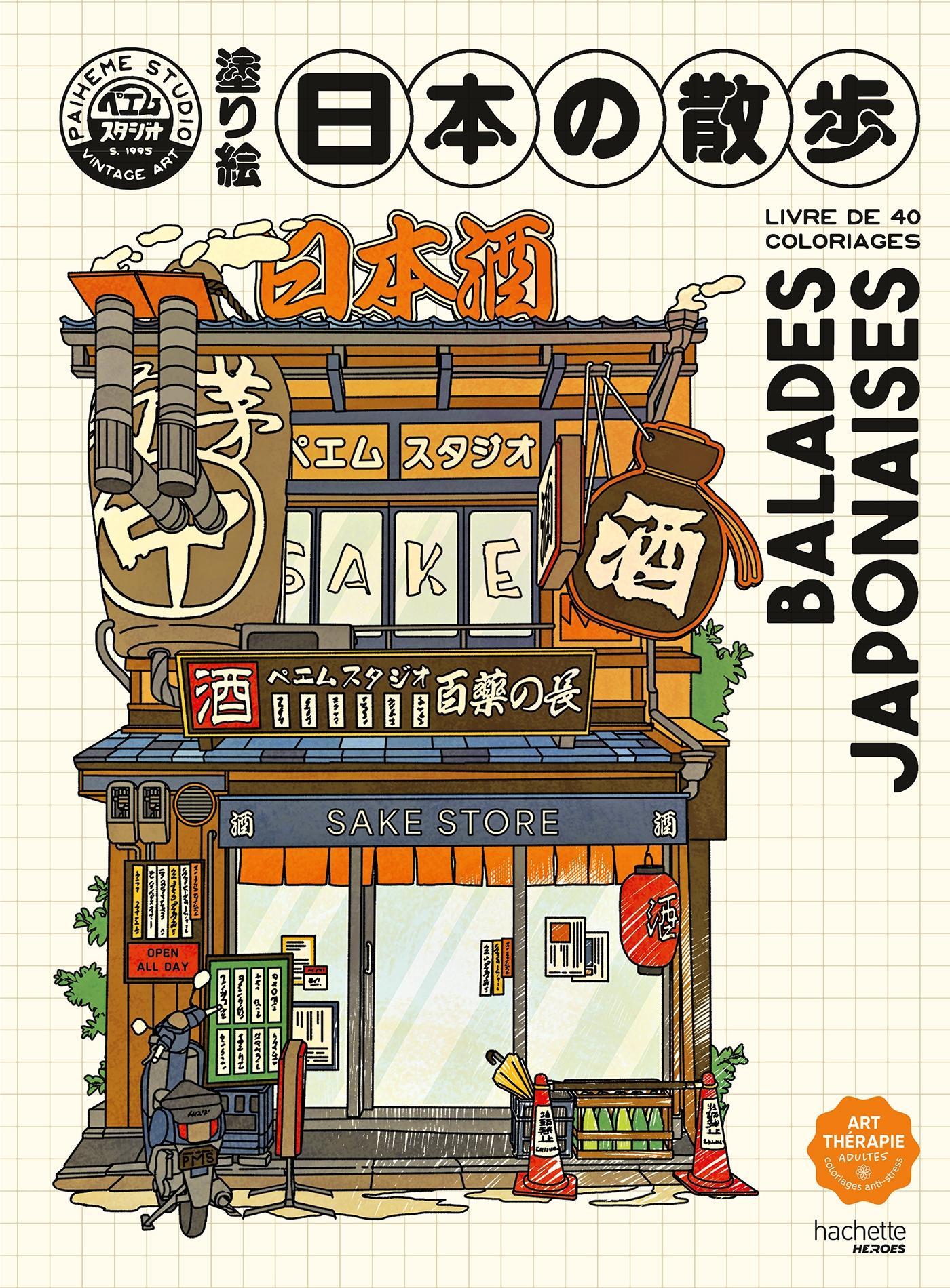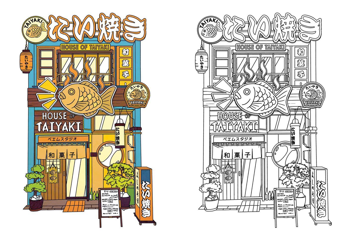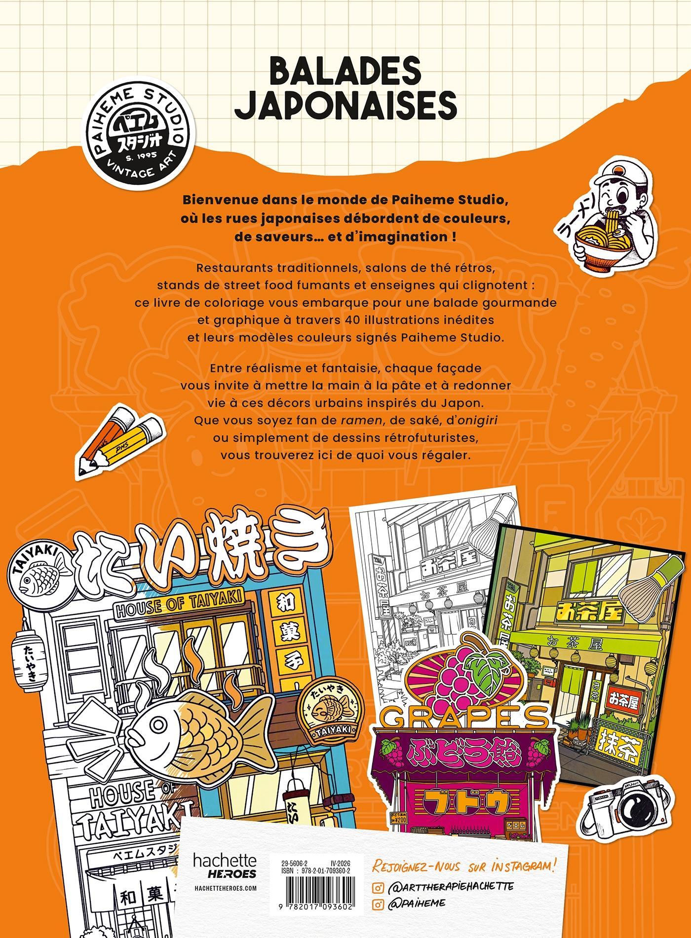 Restaurants traditionnels, salons de thé rétros, stands de street food fumants et enseignes qui clignotent : ce livre de coloriage vous embarque pour une balade gourmande et graphique à travers 40 illustrations inédites et leurs modèles couleurs signés Paiheme Studio.