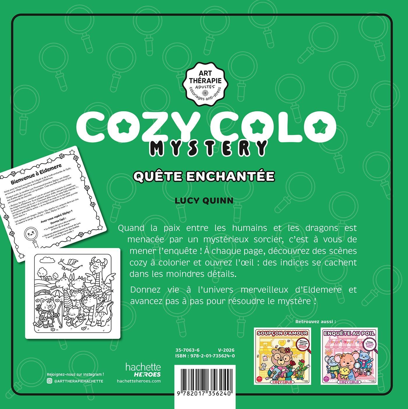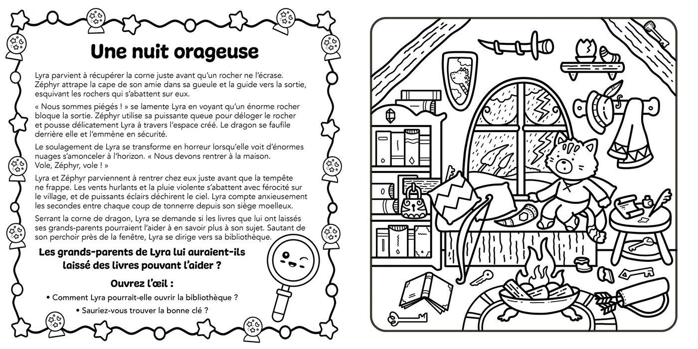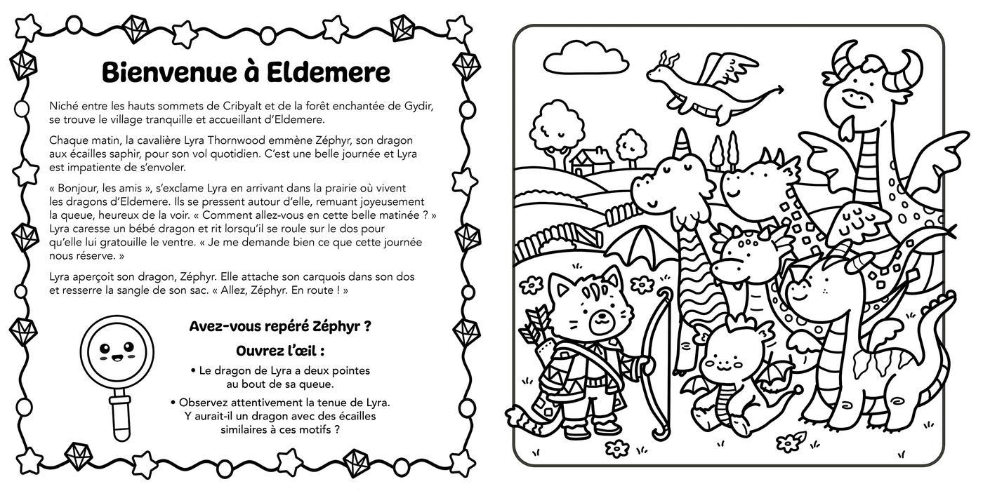 Quand la paix entre les humains et les dragons est menacée par un mystérieux sorcier, c’est à vous de mener l’enquête ! À chaque page, découvrez des scènes cozy à colorier et ouvrez l’oeil : des indices se cachent dans les moindres détails.